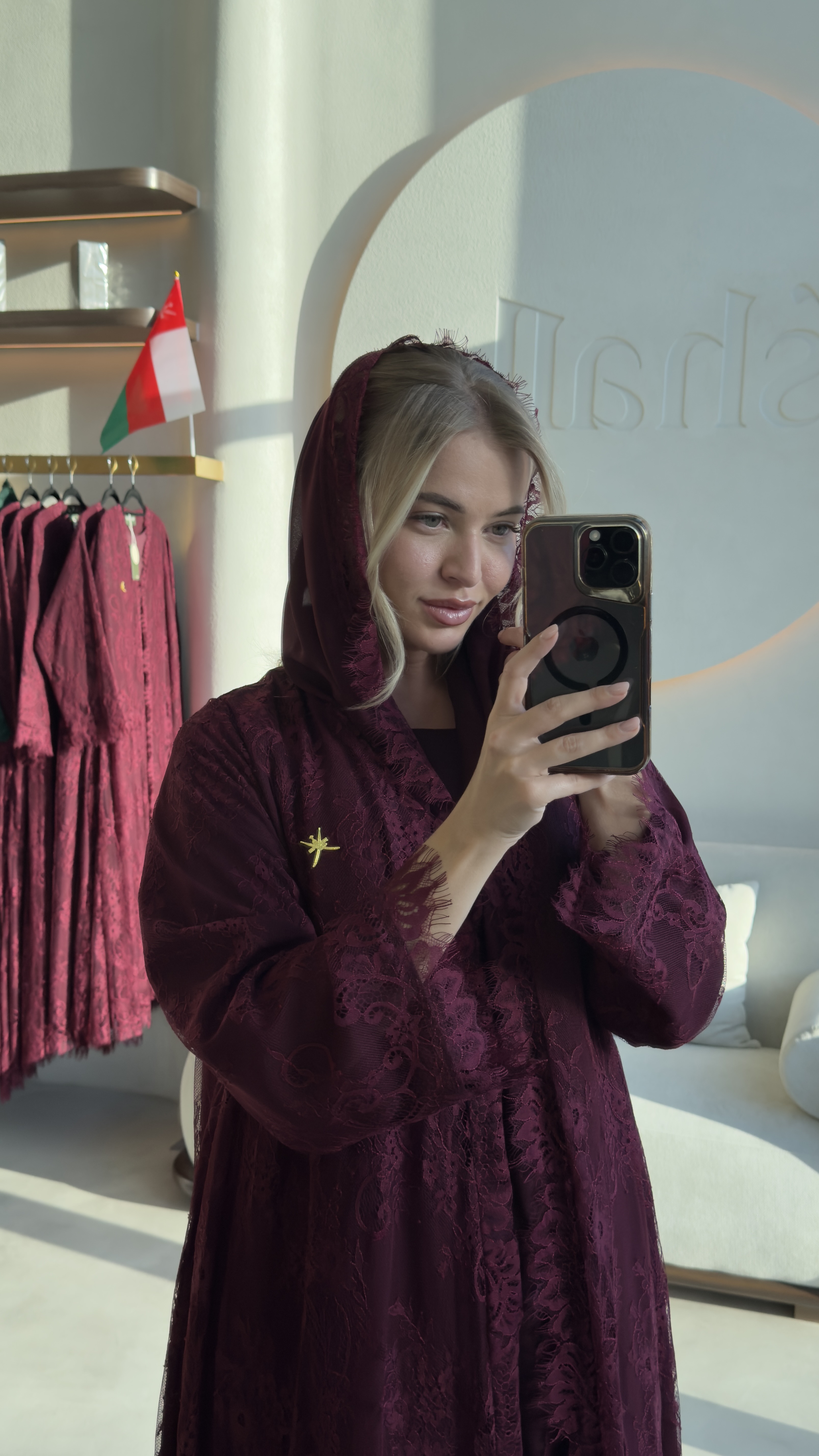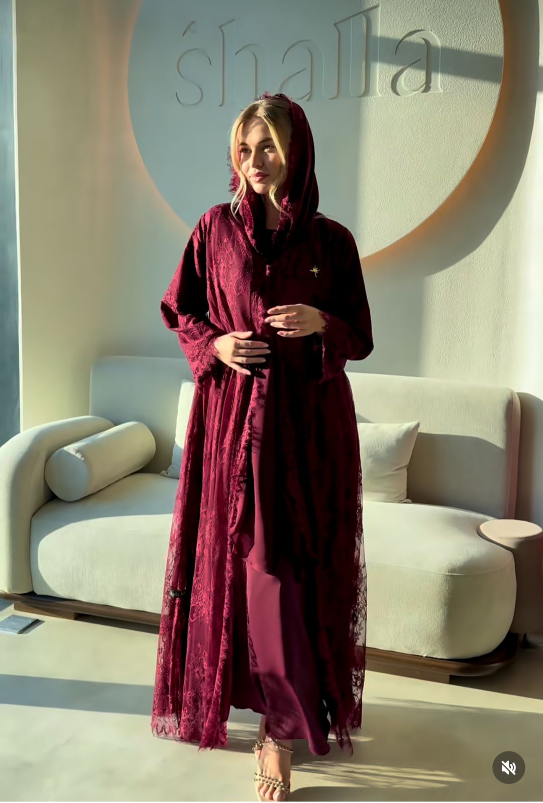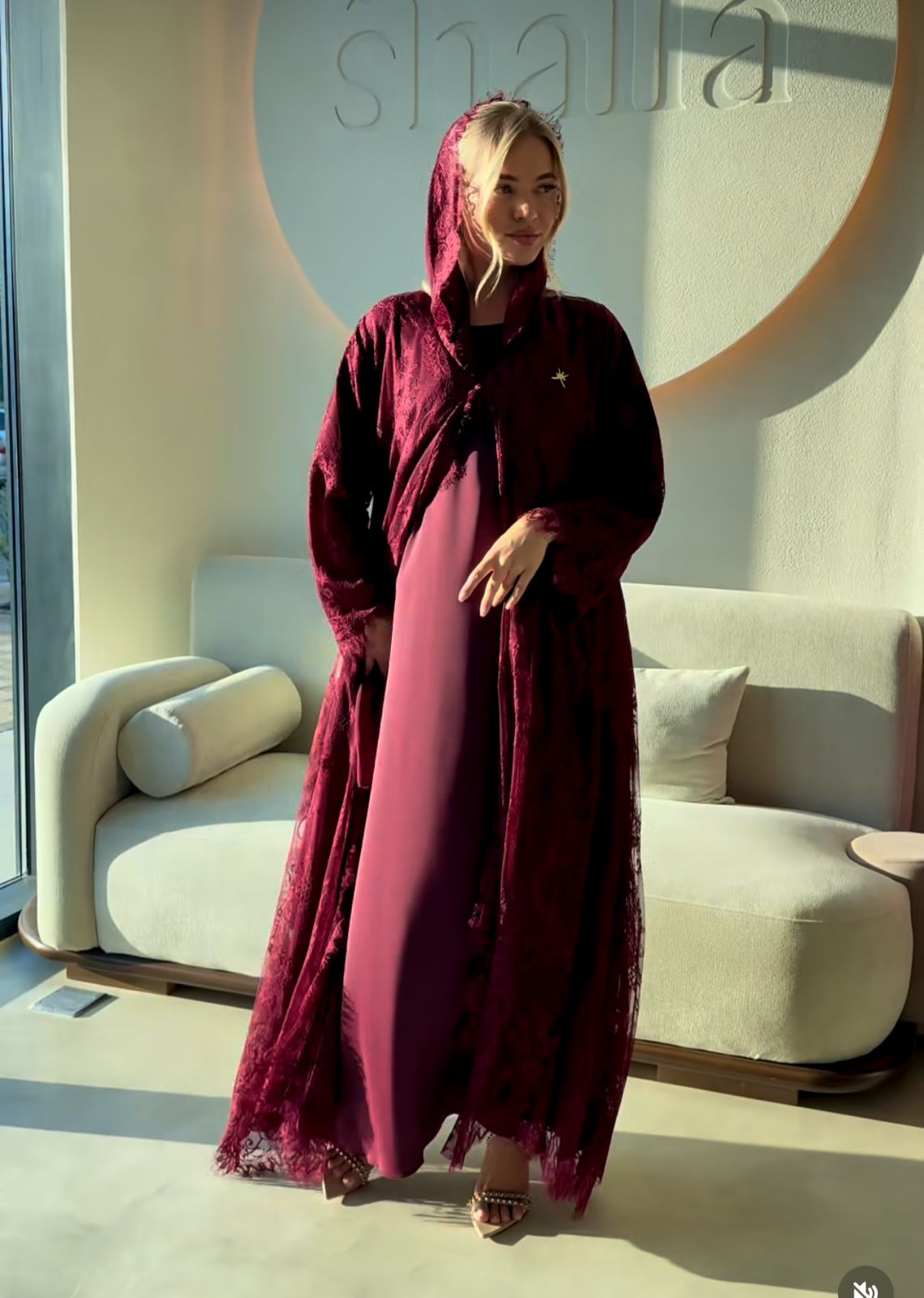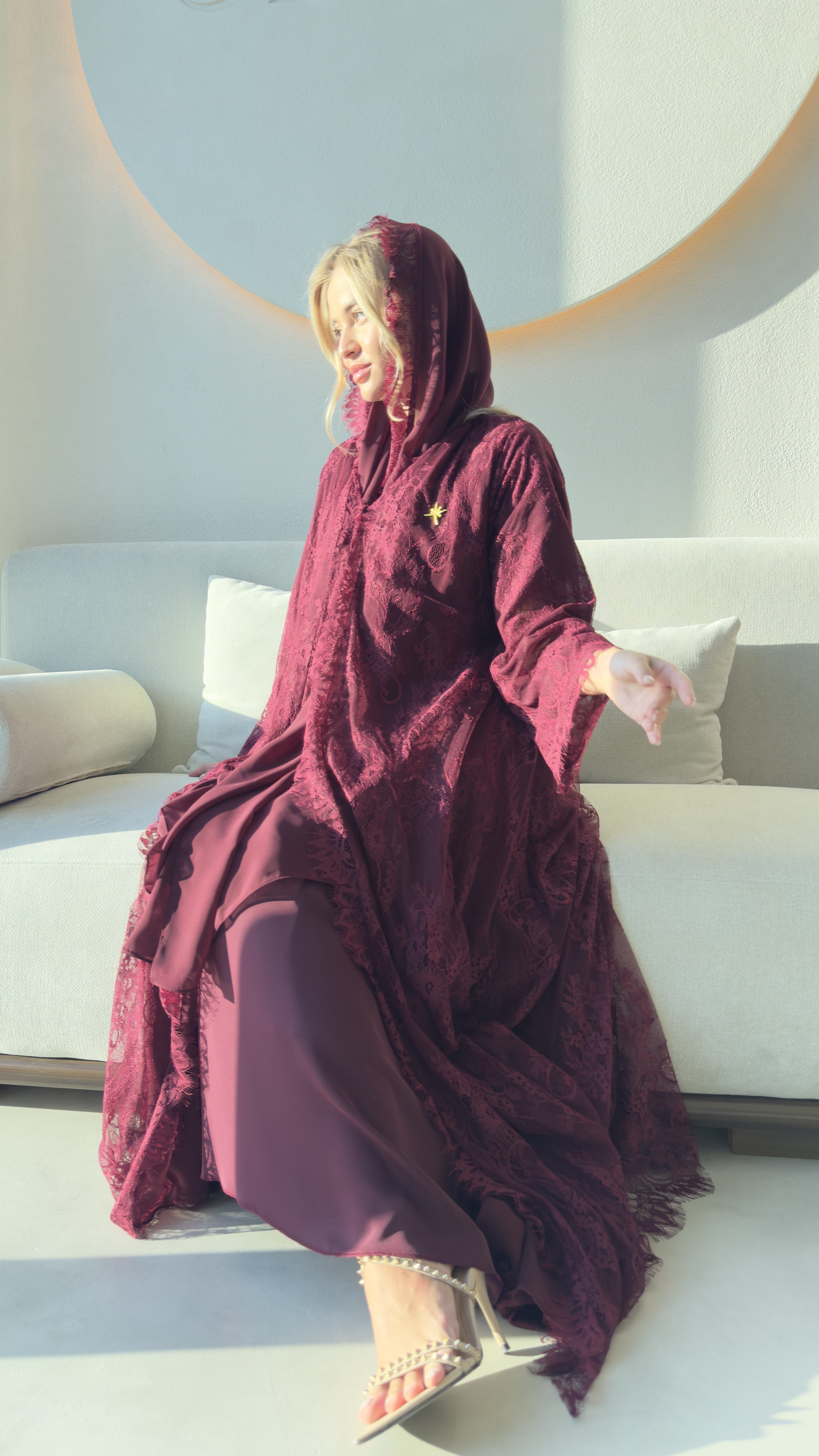 هذه العباية تتميز بتصميم أنيق وفخم بلون عنابي غني، مصنوع بالكامل من قماش الدانتيل الفاخر الذي يضفي لمسة أنثوية راقية. يظهر في التصميم تفاصيل زخرفية دقيقة على الأكمام والحواف، مع قصة واسعة تمنح راحة وانسيابية في الحركة. العباية مزودة بقبعة (كابيشون) تضيف لمسة عصرية، كما يظهر تطريز ذهبي صغير على الجهة الأمامية بشكل أنيق يبرز جمال القطعة. القماش شفاف جزئياً بفضل نقوش الدانتيل، مما يجعلها مثالية للمناسبات الخاصة أو الإطلالات الفاخرة.